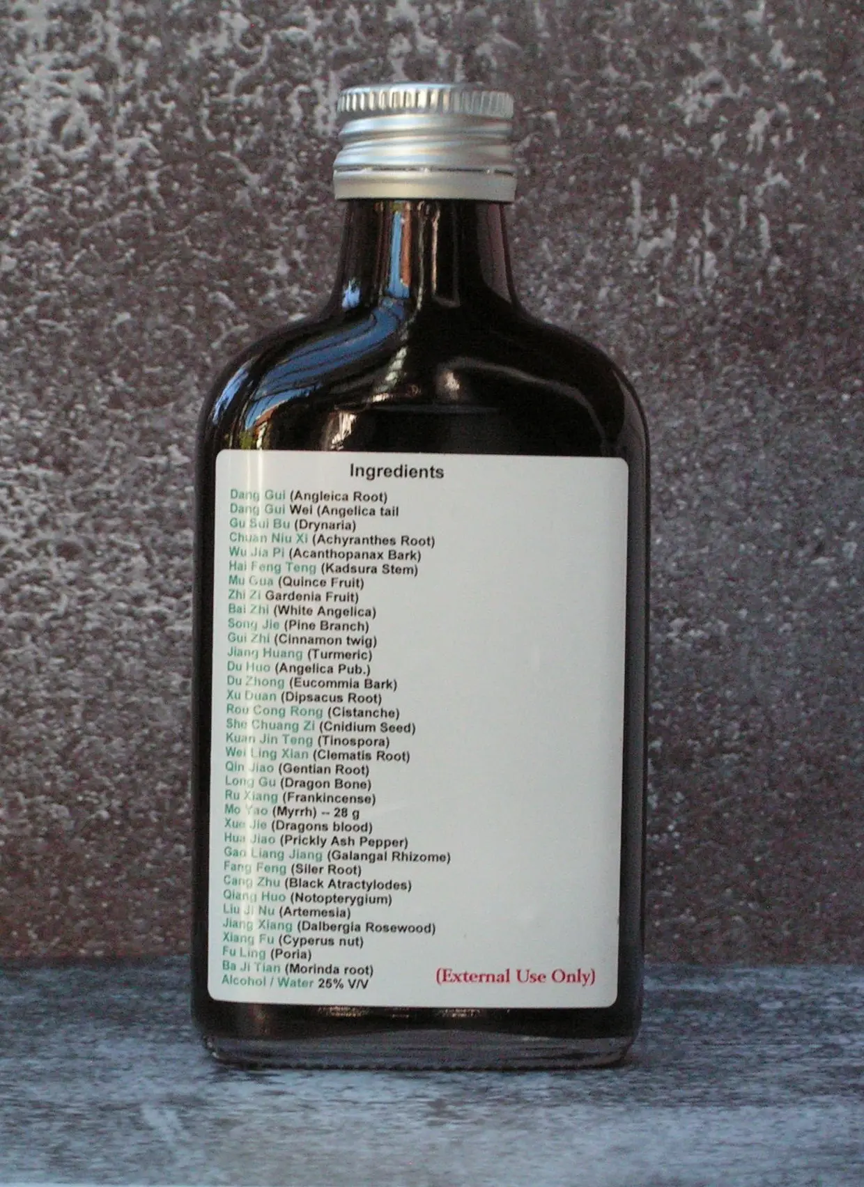 Dang Gui (Angleica Root), Dang Gui Wei (Angelica tail), Gu Sui Bu (Drynaria), Chuan Niu Xi (Achyranthes Root), Wu Jia Pi (Acanthopanax Bark), Hai Feng Teng (Kadsura Stem), Mu Gua (Quince Fruit), Zhi Zi Gardenia Fruit, Bai Zhi (White Angelica), Song Jie (Pine Branch), Gui Zhi (Cinnamon twig), Jiang Huang (Turmeric), Du Huo (Angelica Pub) Du Zhong (Eucommia Bark) Xu Duan (Dipsacus Root), Rou Cong Rong (Cistanche) She Chuang Zi (Cnidium Seed), Kuan Jin Teng (Tinospora) Wei Ling Xian (Clematis Root), Qin Jiao (Gentian Root) Long Gu (Dragon Bone), Ru Xiang (Frankincense), Mo Yao (Myrrh), Xue Jie (Dragons blood), Hua Jiao (Prickly Ash Pepper), Gao Liang Jiang (Galangal Rhizome), Fang Feng (Siler Root), Cang Zhu (Black Atractylodes), Qiang Huo (Notopterygium), Liu Ji Nu (Artemesia) Jiang Xiang (Dalbergia Rosewood), Xiang Fu (Cyperus nut), Fu Ling (Poria), Ba Ji Tian (Morinda root), Alcohol / Water 25% V/V