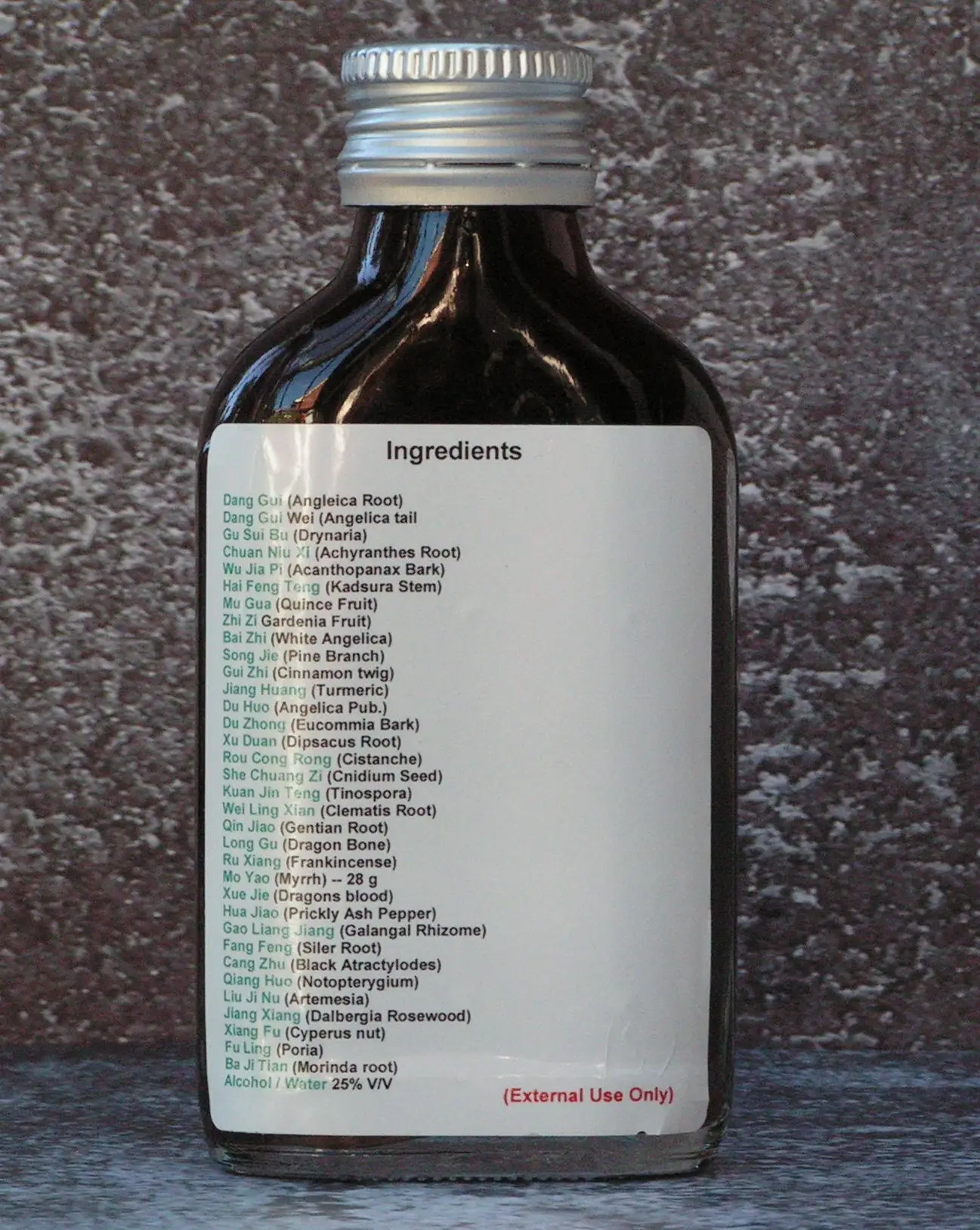 Dang Gui (Angleica Root), Dang Gui Wei (Angelica tail), Gu Sui Bu (Drynaria), Chuan Niu Xi (Achyranthes Root), Wu Jia Pi (Acanthopanax Bark), Hai Feng Teng (Kadsura Stem), Mu Gua (Quince Fruit), Zhi Zi Gardenia Fruit, Bai Zhi (White Angelica), Song Jie (Pine Branch), Gui Zhi (Cinnamon twig), Jiang Huang (Turmeric), Du Huo (Angelica Pub) Du Zhong (Eucommia Bark) Xu Duan (Dipsacus Root), Rou Cong Rong (Cistanche) She Chuang Zi (Cnidium Seed), Kuan Jin Teng (Tinospora) Wei Ling Xian (Clematis Root), Qin Jiao (Gentian Root) Long Gu (Dragon Bone), Ru Xiang (Frankincense), Mo Yao (Myrrh), Xue Jie (Dragons blood), Hua Jiao (Prickly Ash Pepper), Gao Liang Jiang (Galangal Rhizome), Fang Feng (Siler Root), Cang Zhu (Black Atractylodes), Qiang Huo (Notopterygium), Liu Ji Nu (Artemesia) Jiang Xiang (Dalbergia Rosewood), Xiang Fu (Cyperus nut), Fu Ling (Poria), Ba Ji Tian (Morinda root), Alcohol / Water 25% V/V
